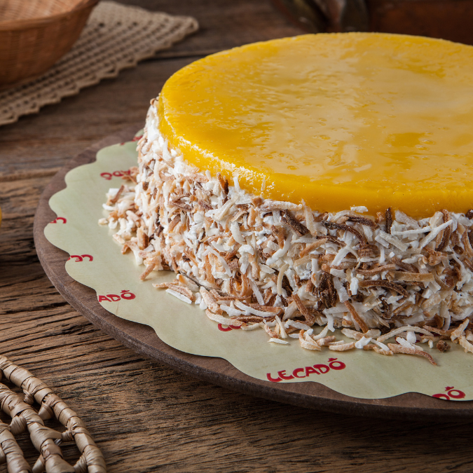 Massa branca com Recheio de Brigadeiro de Quindim e Cobertura de Quindim com bordas de coco ralado queimado.