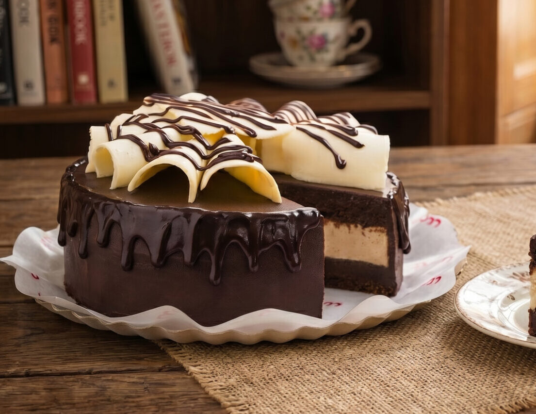 Com camadas de massa branca e de chocolate com recheio generoso de chocolate meio amargo. Finalizada com calda intensa e lascas de chocolate branco.